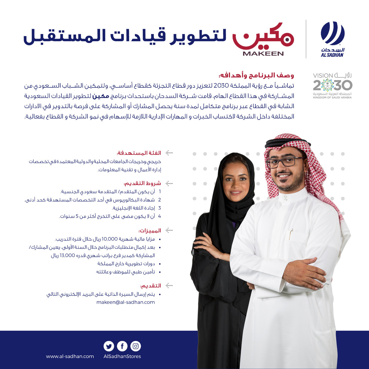 شركة أسواق السدحان التجارية تعلن عن بدء التقديم لبرنامج "مكيـن" لتطوير قيادات المستقبل (رجال/نساء) والذي يهدف إلىاستقطاب الخريجين المتميزين وتمكين الشباب السعودي من المشاركة في هذا القطاع الهام وذلك وفقاً للتفاصيل التالية: