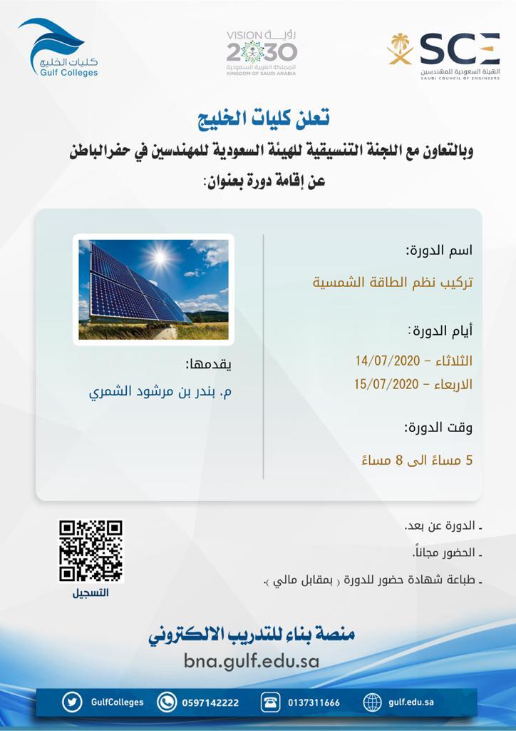 الهيئة السعودية للمهندسين وبالتعاون مع كليات الخليج تعلن عن تقديم دورة مجانية في مجال "الطاقة الشمسية" تستهدف كافة فئات المجتمع (رجال/نساء)، مع منح المتدربين شهادات حضور ، وذلك وفقاً للتفاصيل التالية: