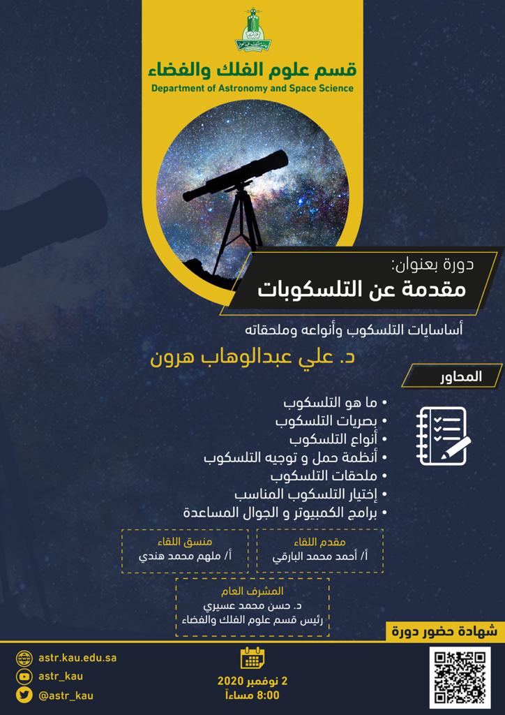 جامعة الملك عبدالعزيز ممثلة في (قسم علوم الفلك والفضاء) تعلن عن تقديم دورة تدريبية مجانية بعنوان: "مقدمة عن التلسكوبات" مع منح المتدربين شهادات حضور معتمدة - وذلك وفقاً للتفاصيل التالية: