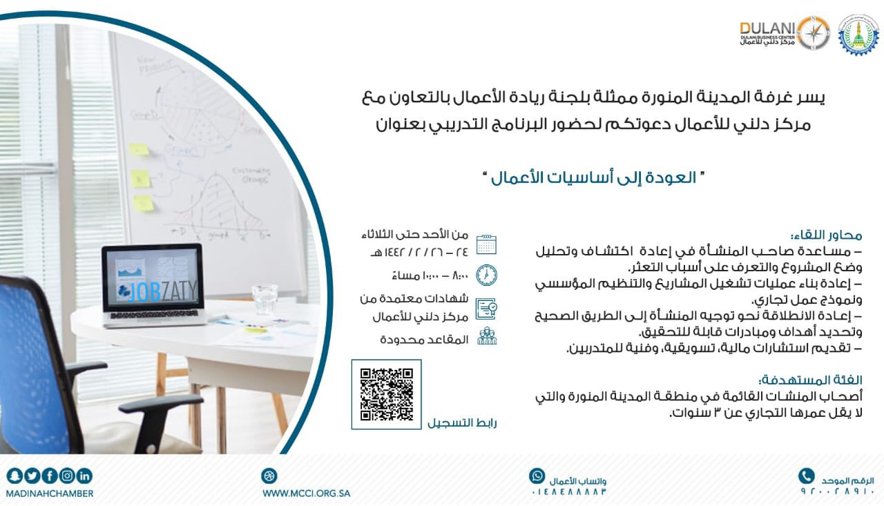 غرفة المدينة المنورة ممثلة بلجنة ريادة الأعمال بالتعاون مع "مركز دلني للأعمال"، (أحد برامج بنك التنمية الاجتماعية) تعلن بدء التسجيل في البرنامج التدريبي بعنوان " العودة إلى أساسيات الأعمال"، وذلك وفقاً للتفاصيل التالية: