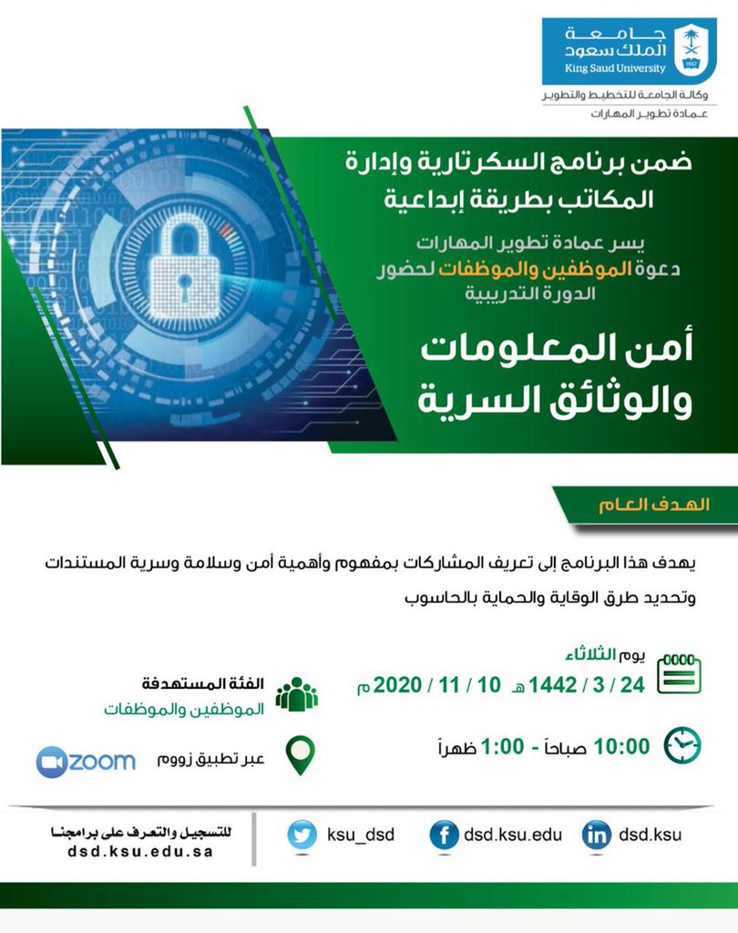 أعلنت جامعة الملك سعود (عمادة تطوير المهارات) عن تقديم دورة تدريبية بعنوان: (أمن المعلومات والوثائق السرية) وذلك ضمن برنامج السكرتارية وإدارةالمكاتب بطريقة إبداعية، وفقاً للتفاصيل التالية: