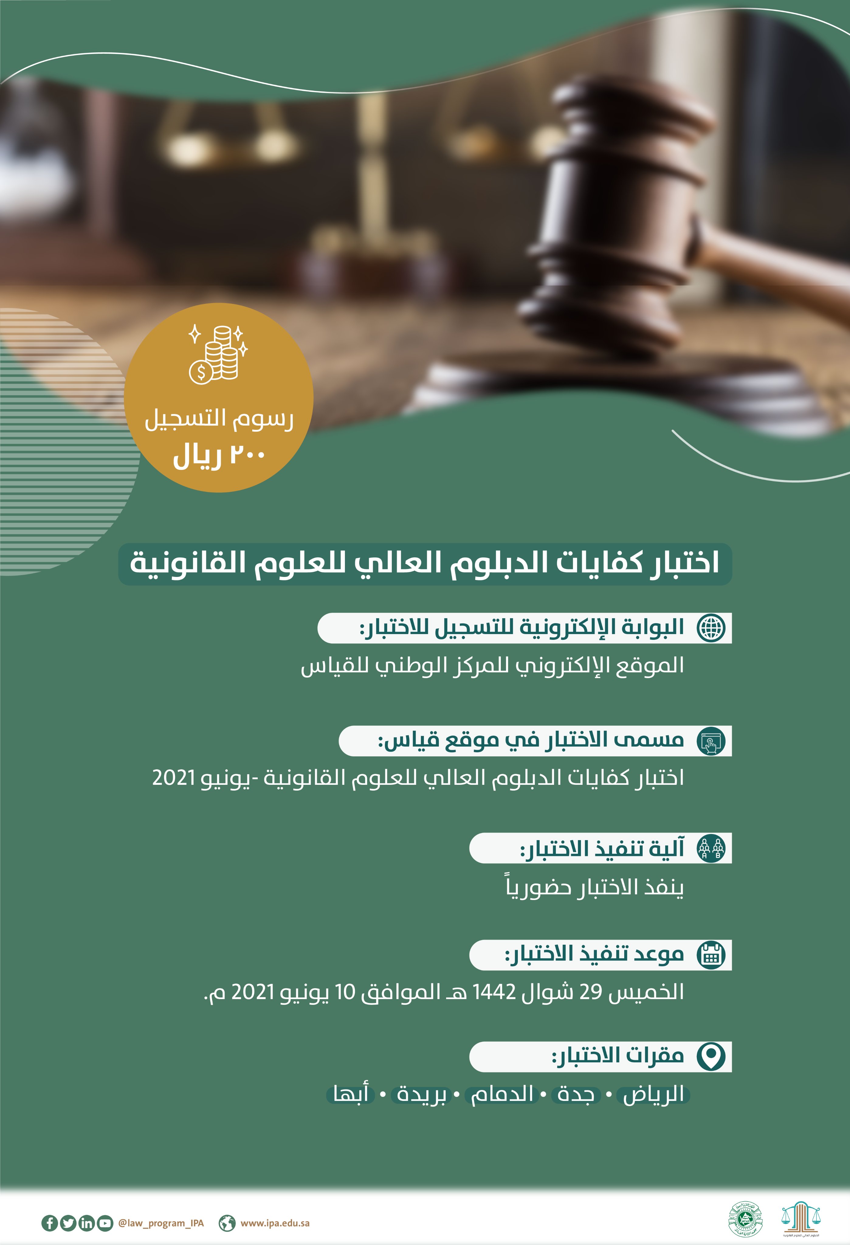 - يبدأ اليوم التسجيل لاختبار كفايات الدبلوم العالي للعلوم القانونية، وهو أحد شروط القبول في الدبلوم، ويمكن (للرجال والنساء) التسجيل في الاختبار للالتحاق بالبرنامج.
