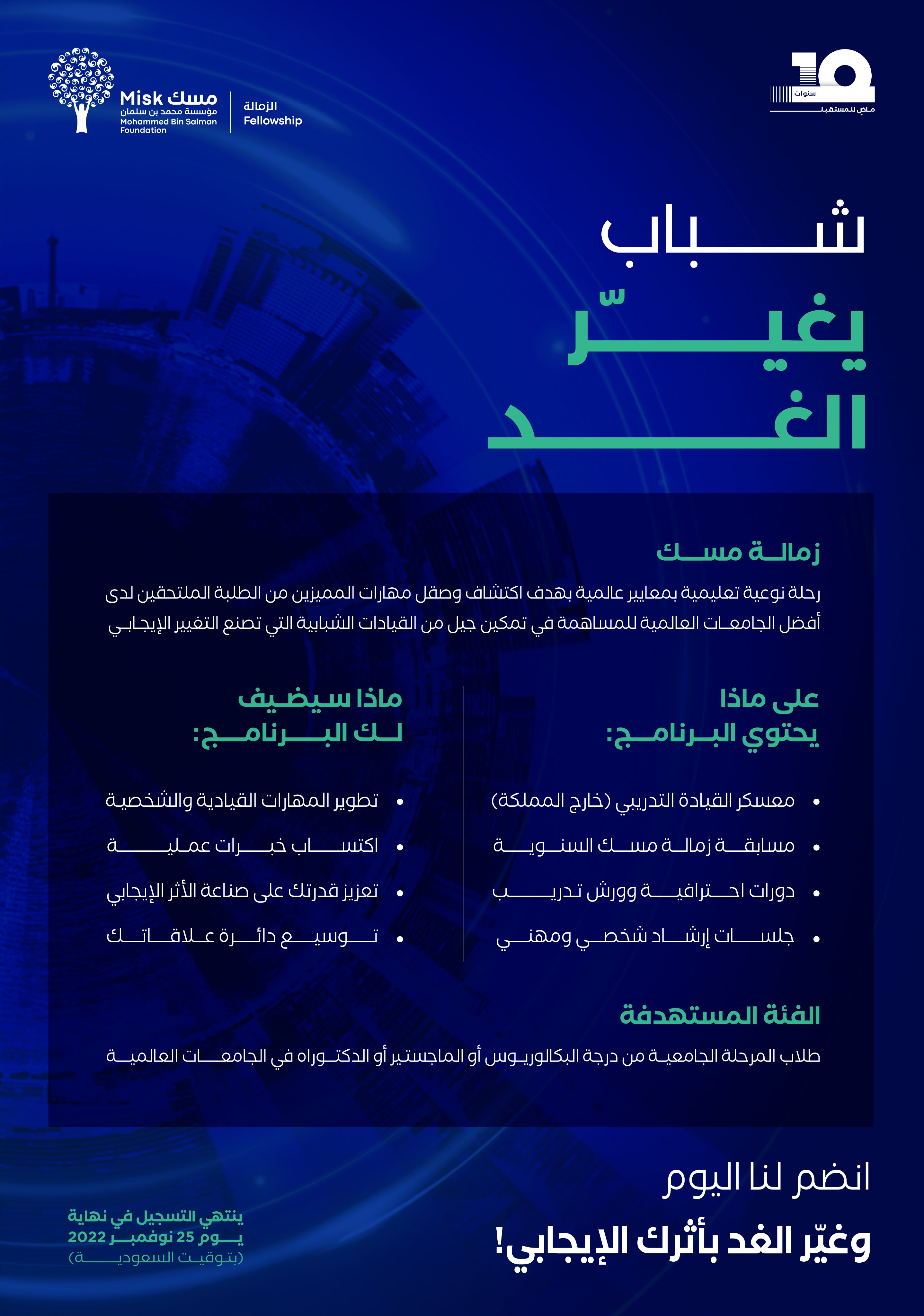 أعلنت مؤسسة صاحب السمو الملكي الأمير محمد بن سلمان (مسك الخيرية) بدء التقديم في (برنامج زمالة مسك) على مدى (6 أشهر) مصمم للشباب السعودي في مرحلة البكالوريوس، الماجستير، والدكتوراه، الراغبين بترك أثر إيجابي وتطوير مهاراتهم القيادية - وفقاً للتفاصيل التالية: