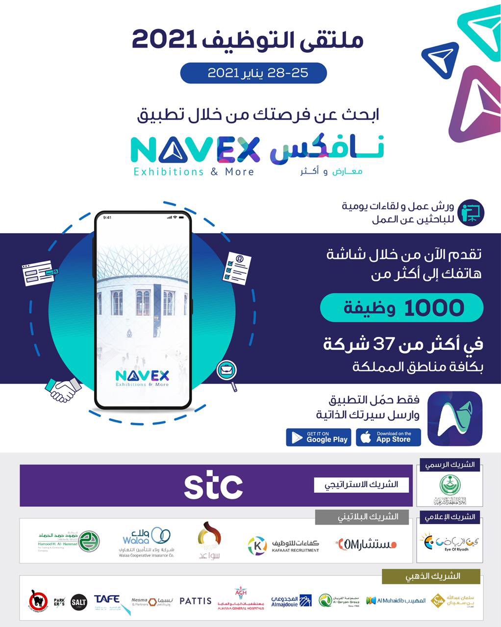 تحت رعاية صاحب السمو الملكي الأمير أحمد بن فهد بن سلمان نائب أمير المنطقة الشرقية ينطلق (ملتقى التوظيف نافكس) خلال الفترة من 25 الى 28 يناير 2021م، حيث ستعرض أكثر من 1000 وظيفة بمختلف انحاء المملكة من خلال تطبيق (نافكس NAVEX ) والذي يقدم تقنية حديثة تمكّن الباحثين عن عمل من الاطلاع على الوظائف والتقدم إليها من خلال تحميل التطبيق عبر الهاتف الجوال.