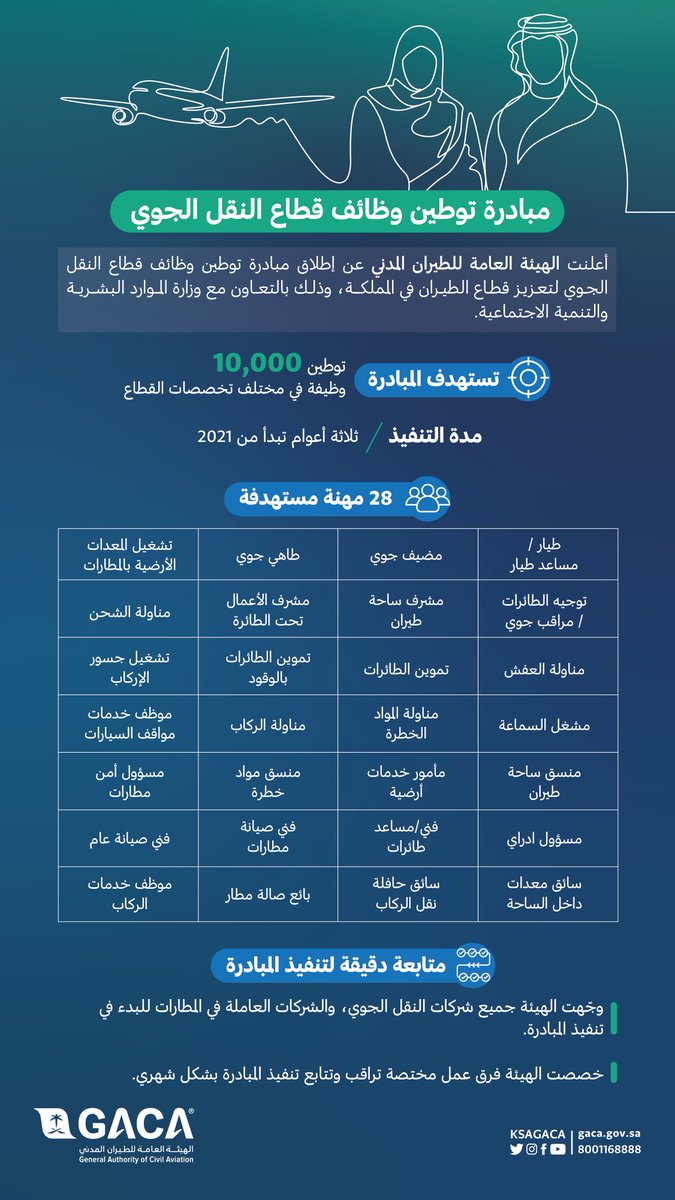 أعلنت الهيئة العامة للطيران المدني اليوم إطلاق مبادرة توطين وظائف قطاع النقل الجوي التي تستهدف توطين (عشرة آلاف وظيفة) في مختلف التخصصات المتعلقة بقطاع الطيران التي تأتي ضمن محور تعزيز قطاع الطيران الذي يُعد أحد أهداف تحقيق رؤية المملكة 2030م.