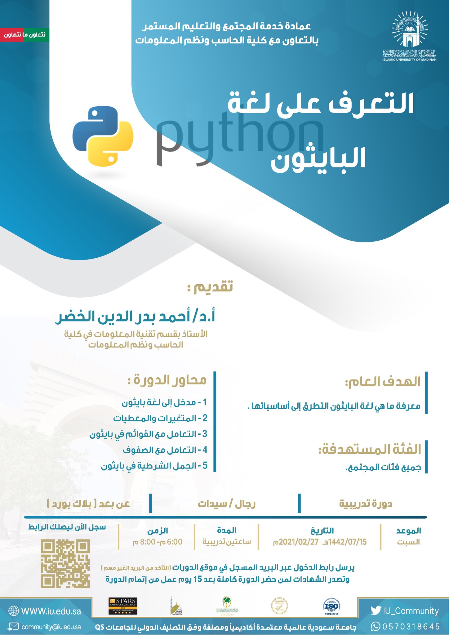 أعلنت الجامعة الإسلامية (عمادة خدمة المجتمع والتعليم المستمر) وبالتعاون مع كلية الحاسب الآلي؛ عن تقديم دورة تدريبية مجانية بعنوان (التعرف على لغة البايثون)، وتستهدف الدورة كافة فئات المجتمع من الرجال والنساء وذلك وفقاً للتفاصيل التالية: