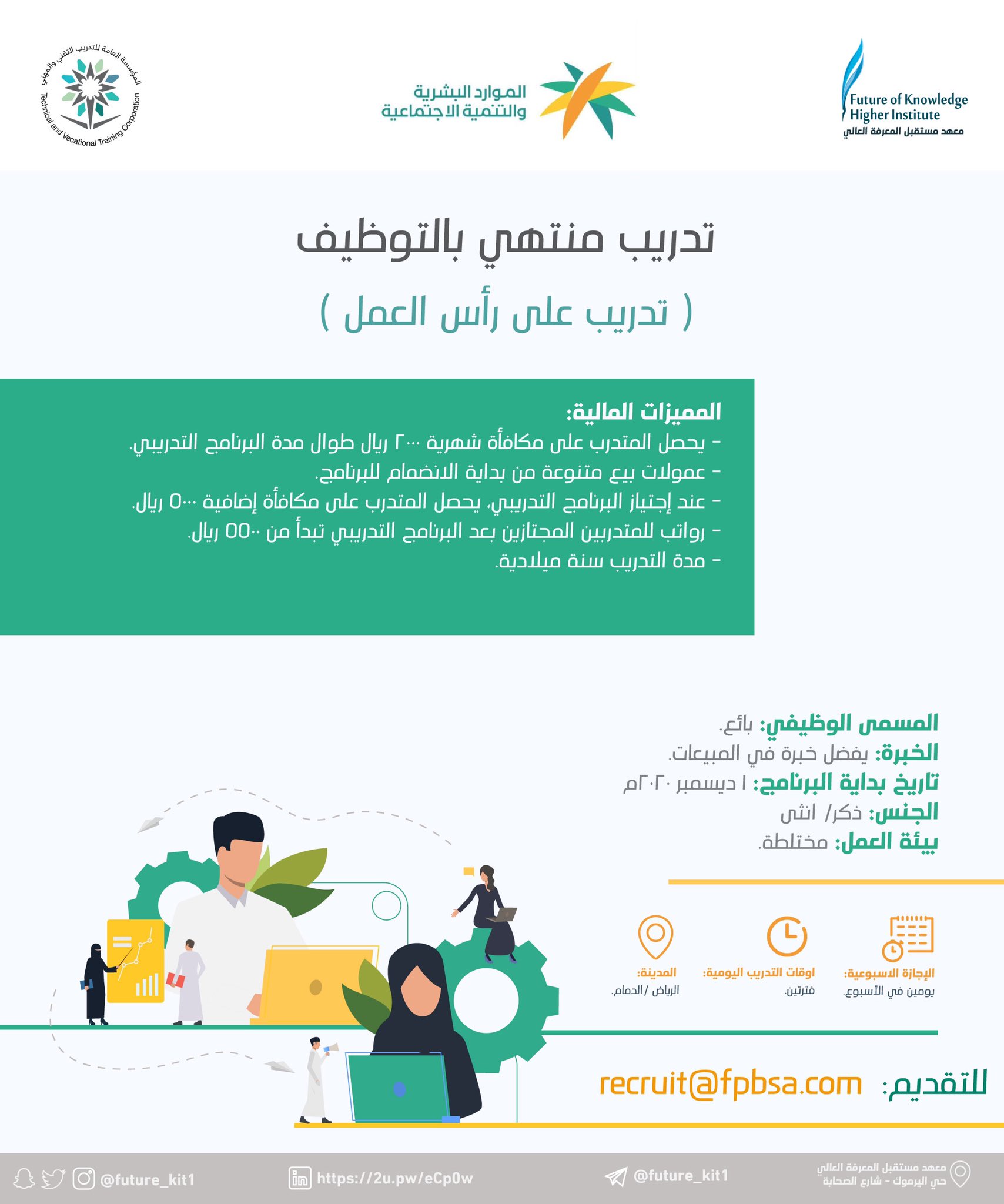 معهد مستقبل المعرفة العالي، يعلن بدء التقديم في برنامج (التدريب على رأس العمل - منتهي بالتوظيف) والذي يستهدف الرجال والنساء من حملة مختلف المؤهلات والتخصصات، بهدف تدريب وتوظيف كوادر وطنية مؤهلة في مجال المبيعات وذلك وفقاً للتفاصيل التالية: