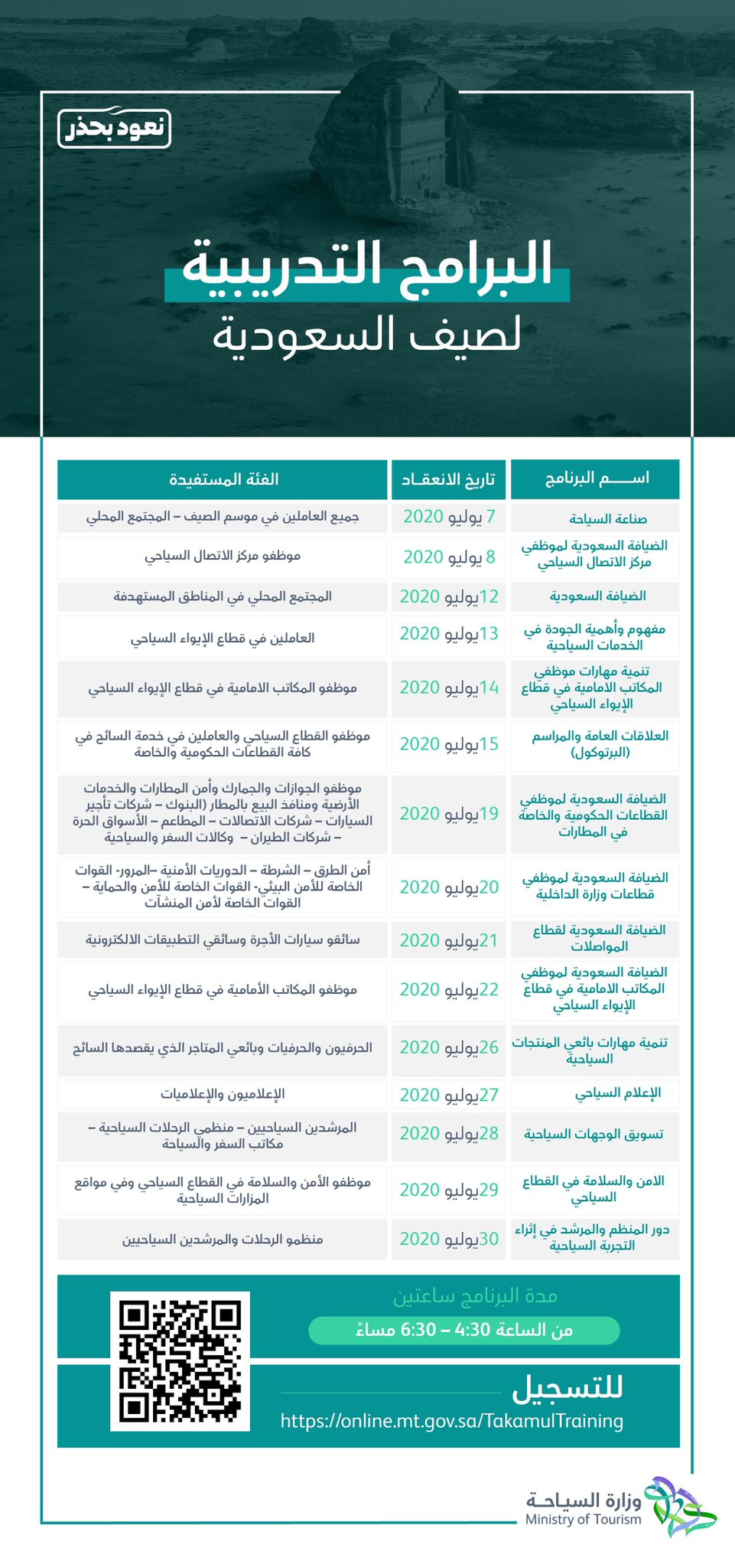 وزارة السياحة تعلن عن تقديم (15) برنامج تدريبي مجاني بشهادت معتمدة، بالتزامن مع إنطلاق موسم (صيف السعودية)، حيث تقام البرامج التدريبية (عن بعد) وتستهدف كافة فئات المجتمع،وذلك وفقاً للتفاصيل التالية: