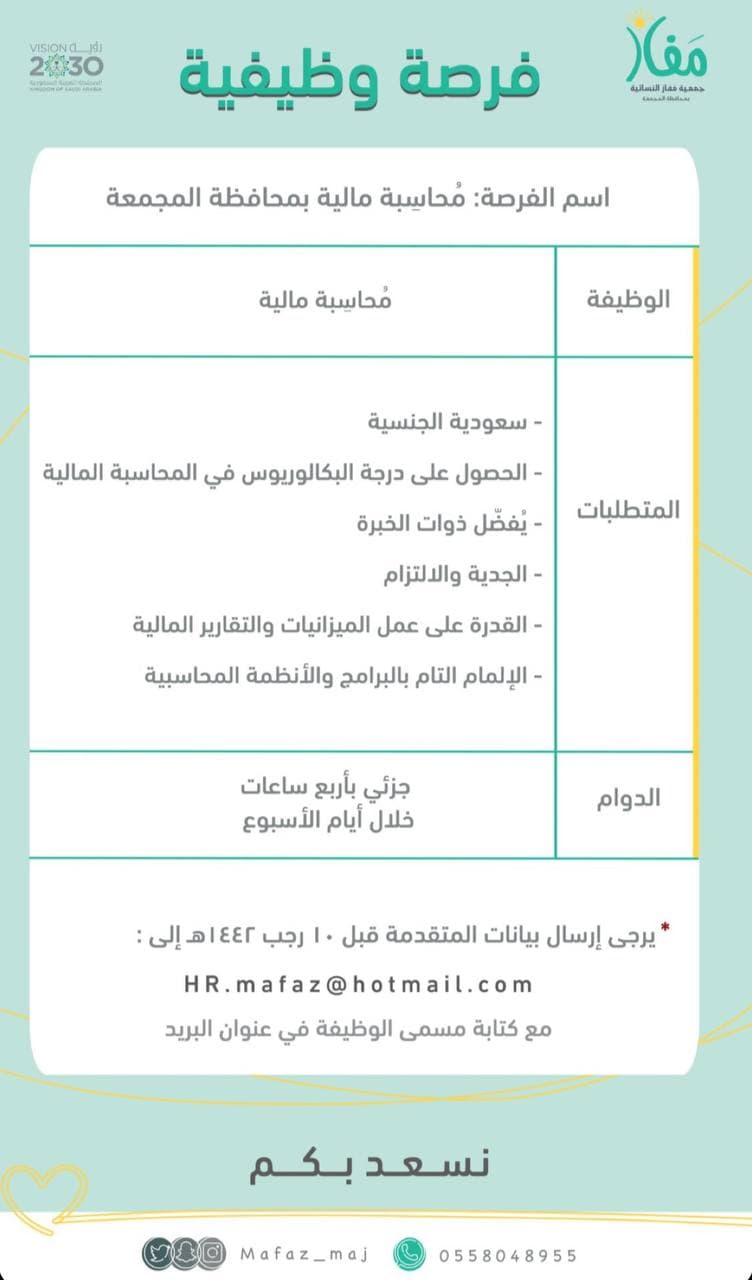 توفر وظائف شاغرة لحملة البكالوريوس من النساء للعمل بمجال المحاسبة بمقر الجمعية بمدينة المجمعة، مع ملاحظة أن التقديم متاح للسعوديين فقط، وذلك وفقاً للتفاصيل التالية: