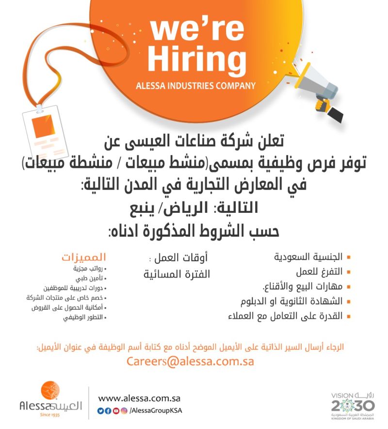 توفر وظائف شاغرة لحملة الثانوية فما فوق للعمل بمجال المبيعات؛ بمعارض الشركة في (الرياض / ينبع) - مع ملاحظة أن التقديم متاح للسعوديين فقط، وفقاً للتفاصيل التالية: