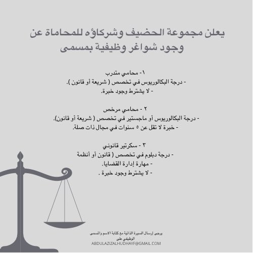 توفر وظائف قانونية شاغرة لحملة (الدبلوم / البكالوريوس) - حديثي التخرج فما فوق، للعمل بمجال المحاماه والإستشارات القانونية والسكرتارية؛ بمقر المجموعة بمدينة الرياض، مع ملاحظة أن التقديم متاح للسعوديين فقط، وفقاً للتفاصيل التالية: