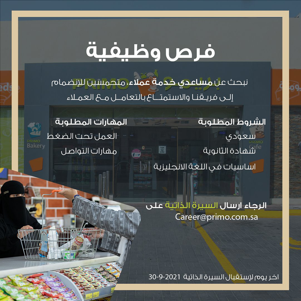 تعلن فتح باب التوظيف لحملة الثانوية فما فوق للعمل بمجال (خدمة العملاء) بفروع متاجرها (بريمو) في عدة مدن بالمملكة، وفقاً للتفاصيل التالية:
