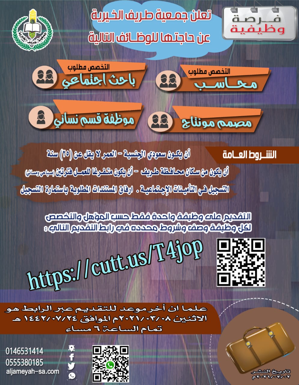 توفر وظائف شاغرة لحملة الثانوية فما فوق؛ من الرجال والنساء للعمل بمقر الجمعية بطريف، مع ملاحظة أن التقديم متاح للسعوديين فقط، وفقاً للتفاصيل التالية: