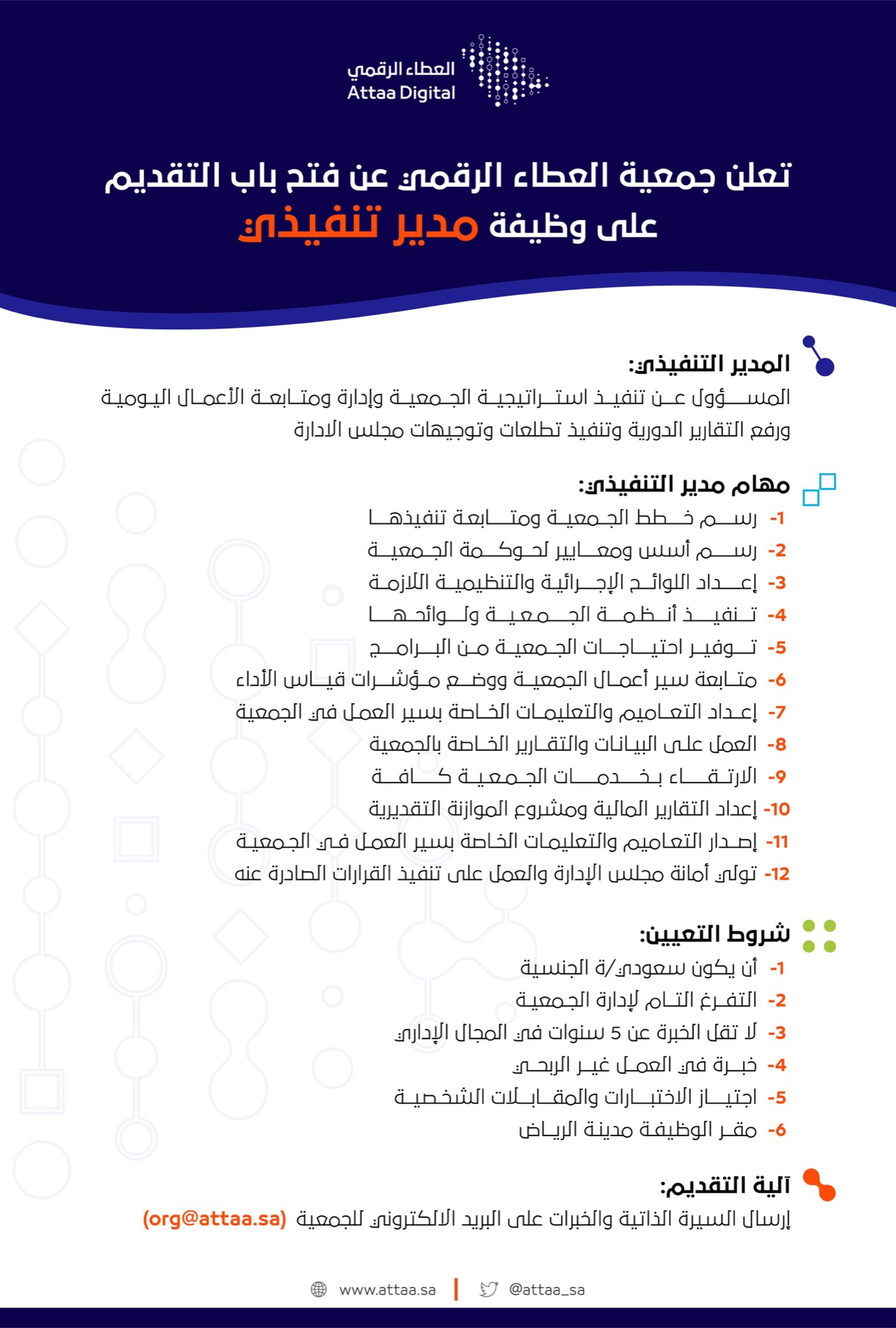 توفر وظائف شاغرة للرجال والنساء للعمل بمجال الإدارة التنفيذية بمقر الجمعية بمدينة الرياض، مع ملاحظة أن التقديم متاح للسعوديين فقط، وذلك وفقاً للتفاصيل التالية: