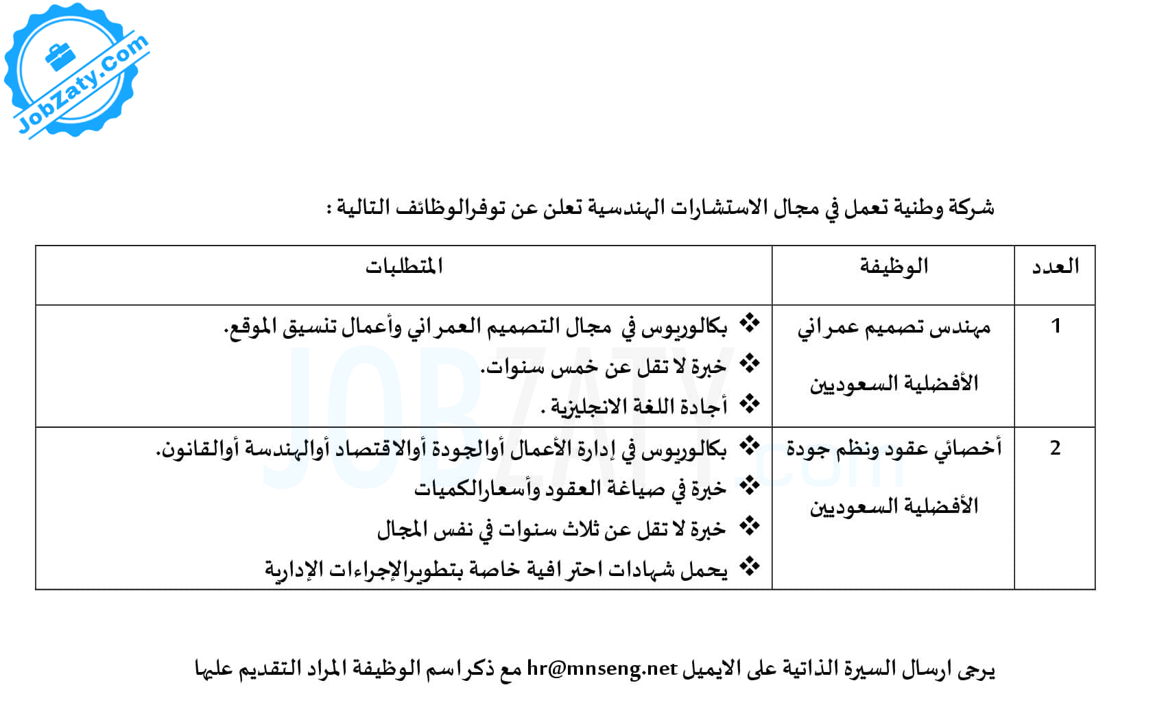 توفر وظائف شاغرة للعمل بعدة مجالات هندسية وإدارية لحملة البكالوريوس بـ مدينة الرياض (الأفضلية للسعوديين)، وفقاً للتفاصيل التالية: