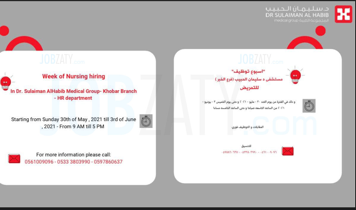 تعلن عن إقامة (أسبوع توظيف) لخريجي وخريجات التمريض للعمل بـ (فرع الخبر) - مقابلات وتوظيف فوري - مع ملاحظة أن (أفضلية) التقديم للسعوديين، وفقاً للتفاصيل التالية: