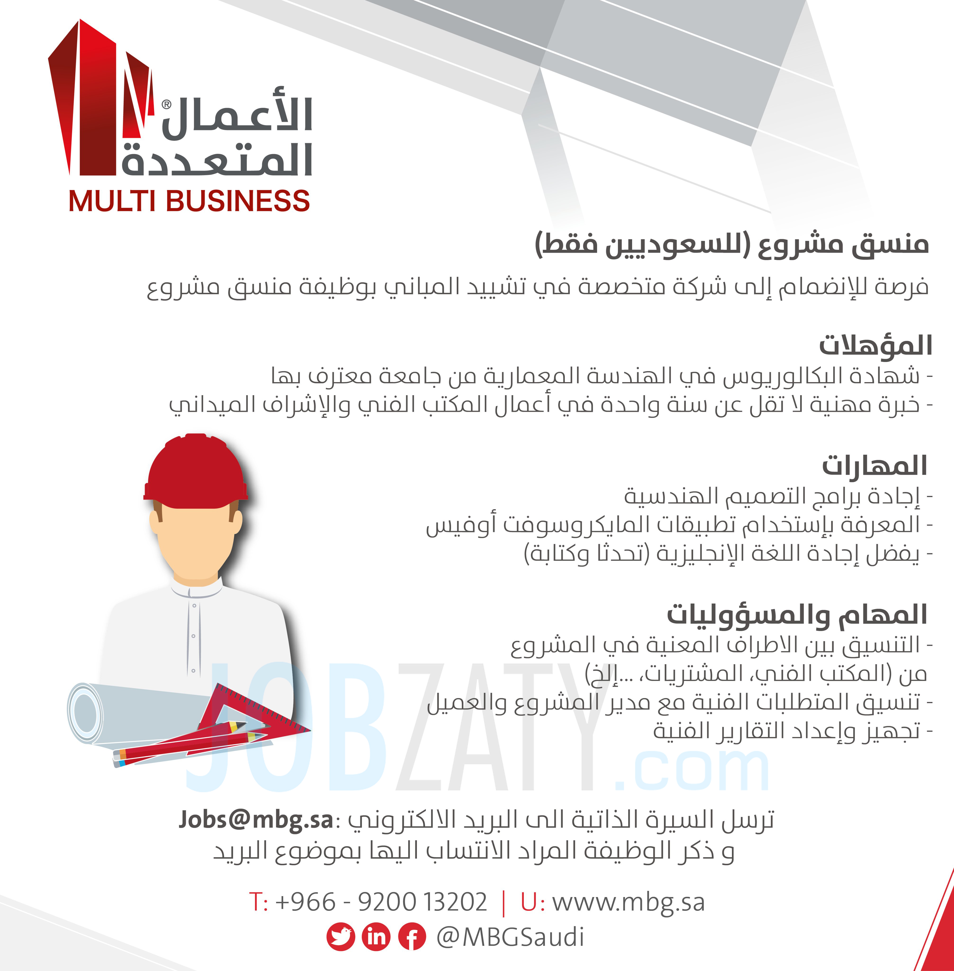 توفر وظائف شاغرة لحملة البكالوريوس للعمل بمجال تنسيق المشاريع وتشييد المباني، مع ملاحظة أن التقديم متاح للسعوديين فقط، وفقاً للتفاصيل التالية: