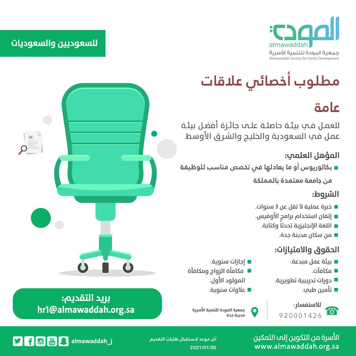 تعلن طرح وظائف شاغرة للرجال والنساء للعمل بمجال العلاقات العامة بمدينة جدة - مع ملاحظة أن الوظائف متاحة للسعوديين فقط، وذلك وفقاً للتفاصيل التالية: