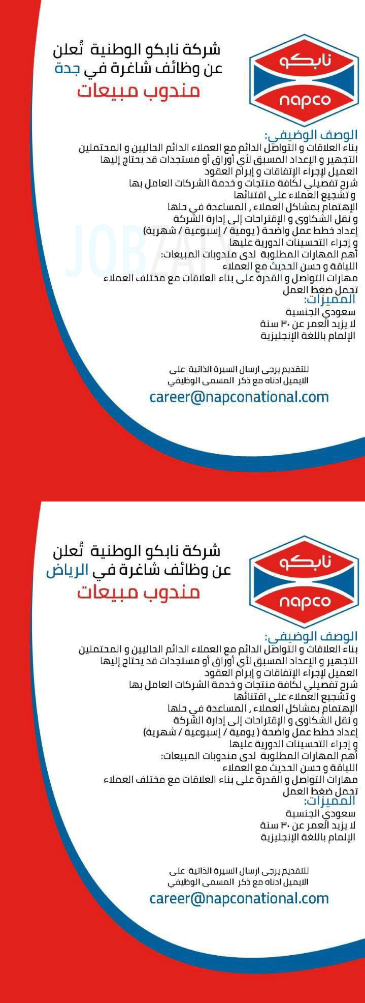 توفر وظائف شاغرة لحملة الثانوية فما فوق بمجال المبيعات للعمل بـ (جدة، الرياض) - مع ملاحظة أن التقديم متاح للسعوديين فقط، وفقاً للتفاصيل التالية: