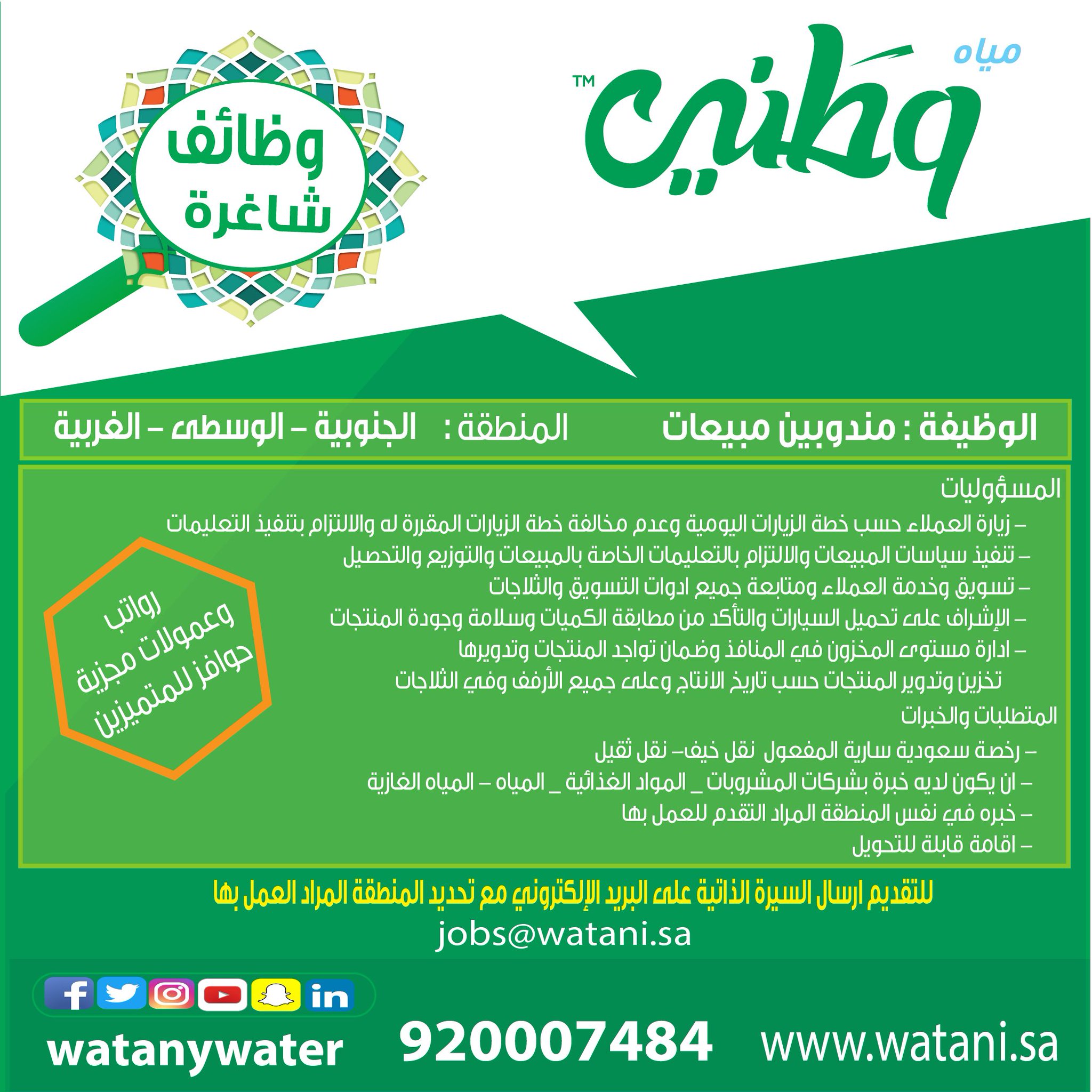 يوفر وظائف شاغرة للعمل بمجال المبيعات، بفروع الشركة بكلاً من: الجنوبية، الوسطى، الغربية، مع ملاحظة أن التقديم متاح للسعوديين فقط، وفقاً للتفاصيل التالية: