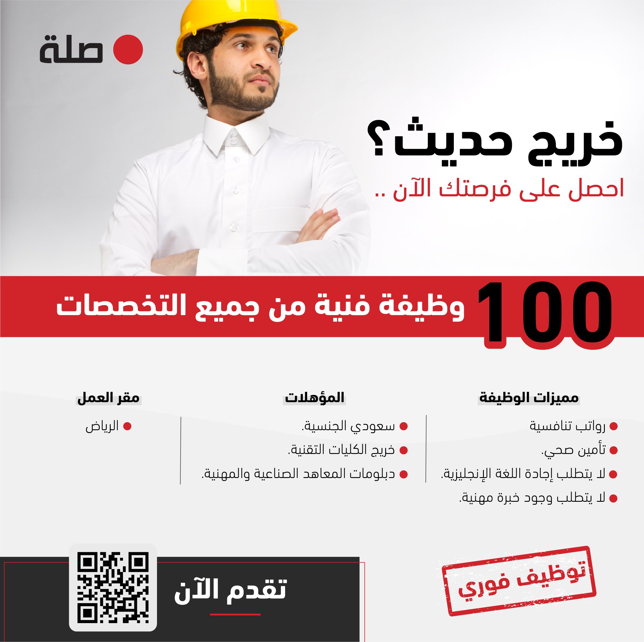 تعلن طرح (100) وظيفة فنية لخريجي الكليات التقنية والمعاهد الصناعية والمهنية - للعمل بمدينة الرياض، مع ملاحظة أن التقديم متاح للسعوديين فقط، وذلك وفقاً للتفاصيل التالية: