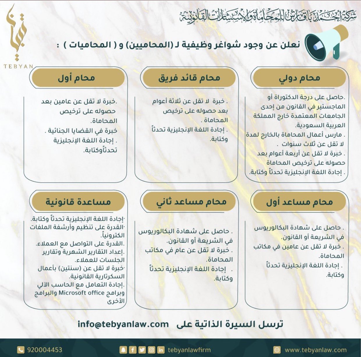 توفر (6) وظائف قانونية شاغرة لحملة البكالوريوس فما فوق (للرجال والنساء)، مع ملاحظة أن التقديم متاح للسعوديين فقط، وفقاً للتفاصيل التالية: