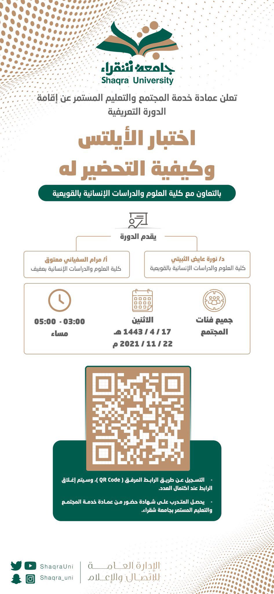 جامعة شقراء تعلن عن تقديم دورة تدريبية مجانية (عن بعد) بعنوان (اختبار الأيلتس وكيفية التحضير له) تستهدف كافة فئات المجتمع من الرجال والنساء - مع منح المتدربين شهادات معتمدة من الجامعة، وذلك وفقاً للتفاصيل التالية: