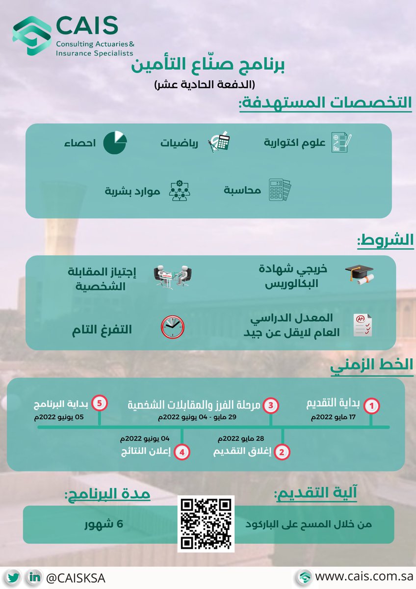 أعلنت شركة المتحدون للخدمات الاكتوارية، بدء التقديم في البرنامج التدريبي (صنّاع التأمين - الدفعة الحادية عشر) لعام 2022م، والذي يستهدف خريجي وخريجات البكالوريوس في عدة تخصصات، بهدف تنمية الموارد البشرية الوطنية المتخصصة، مع العديد من المزايا، وذلك وفقاً للتفاصيل التالية: