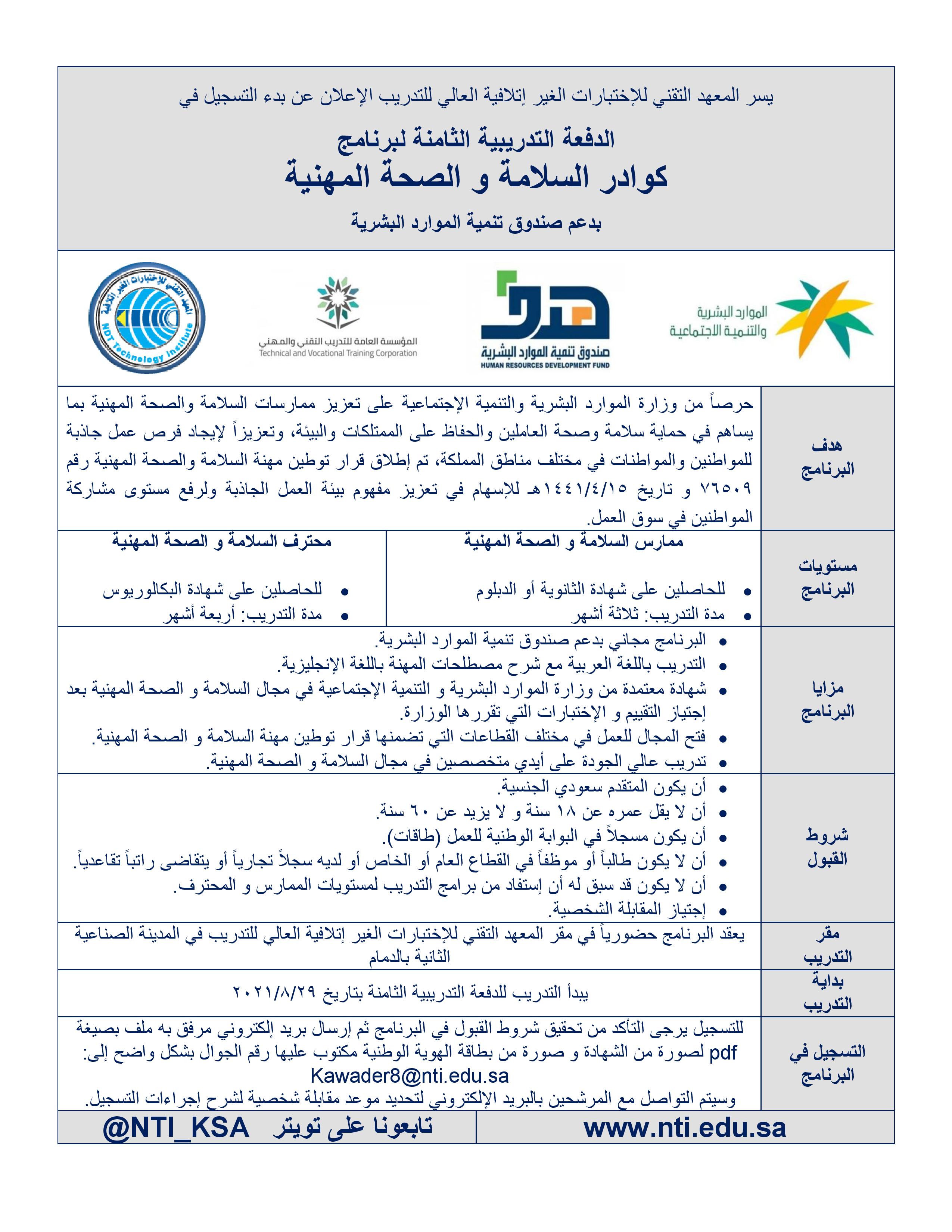 المعهد التقني للإختبارات الغير إتلافية بالتعاون مع وزارة الموارد البشرية يعلن عن إطلاق برنامج (كوادر السلامة والصحة المهنية - الدفعة التدريبية الثامنة) وذلك ضمن مبادرات تطوير وتأهيل الخريجين في مجال الصحة والسلامة والمدعومة بالكامل من صندوق (هدف)، وذلك لتعزيز معرفة ومهارة الكوادر البشرية في مجال السلامة والصحة المهنية وتعزيز تطبيق ممارسات السلامة والصحة المهنية في المنشآت، وذلك وفقاً للتفاصيل التالية: