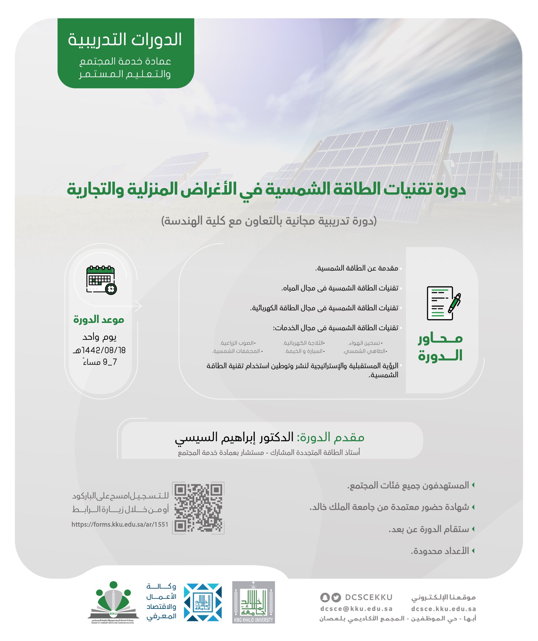 جامعة الملك خالد (عمادة خدمة المجتمع والتعليم المستمر) تعلن عن تقديم دورة تدريبية مجانية بعنوان (تقنيات الطاقة الشمسية)، وذلك بالتعاون مع كلية الهندسة، مع منح المتدربين شهادات حضور معتمدة، وتستهدف الدورة كافة فئات المجتمع من الجنسين - وفقاً للتفاصيل التالية: