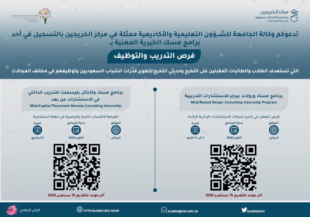 أعلنت جامعة الملك سعود ممثلة في مركز الخريجين عن فتح باب التسجيل في برامج جديدة لفرص التدريب والتوظيف، وذلك بالتعاون مع "مؤسسة مسك الخيرية"، وفقا للتفاصيل التالية: