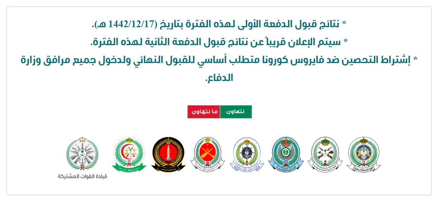 وزارة الدفاع تعلن نتائج قبول الدفعة الأولي للقبول في التجنيد الموحد بتاريخ 17-12-1442هـ