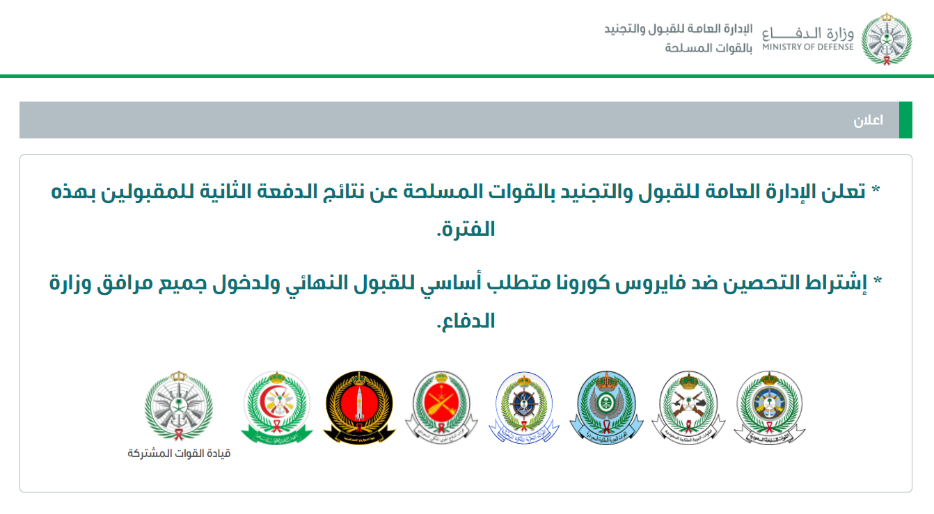 2- اشتراط التحصين ضد فايروس كورونا متطلب أساسي للقبول النهائي ولدخول جميع مرافق وزارة الدفاع.