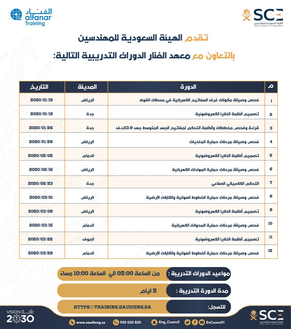 أعلنت الهيئة السعودية للمهندسين، بالتعاون مع معهد الفنار للتدريب عن إقامة دورات تدريبية في عدة مناطق بالمملكة، وذلك وفقا للتفاصيل التالية: