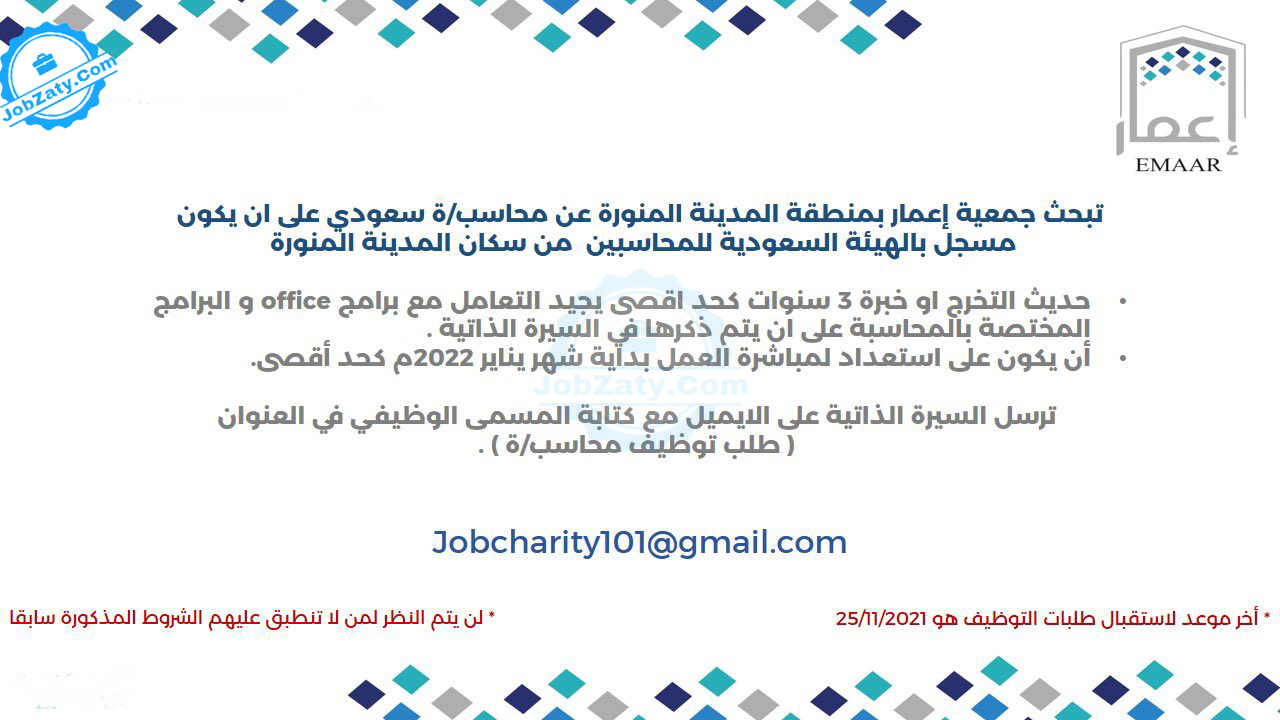 يوفر وظائف شاغرة لخريجي البكالوريوس للعمل بمجال المحاسبة - بمقر الجمعية بالمدينة المنورة - وفقاً للتفاصيل التالية:
