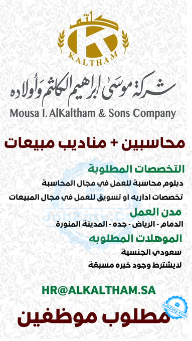 توفر وظائف شاغرة لخريجي الدبلوم أو لبكالوريوس للعمل بمجال المحاسبة، المبيعات بفروع الشركة بكلاً من (الرياض، جدة، الدمام، المدينة المنورة) - وفقاً للتفاصيل التالية: