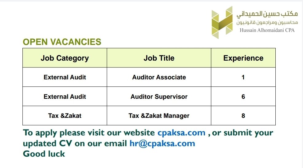 يوفر وظائف شاغرة لحملة البكالوريوس في مجال المحاسبة والمراجعة وفقاً للمسميات التالية: