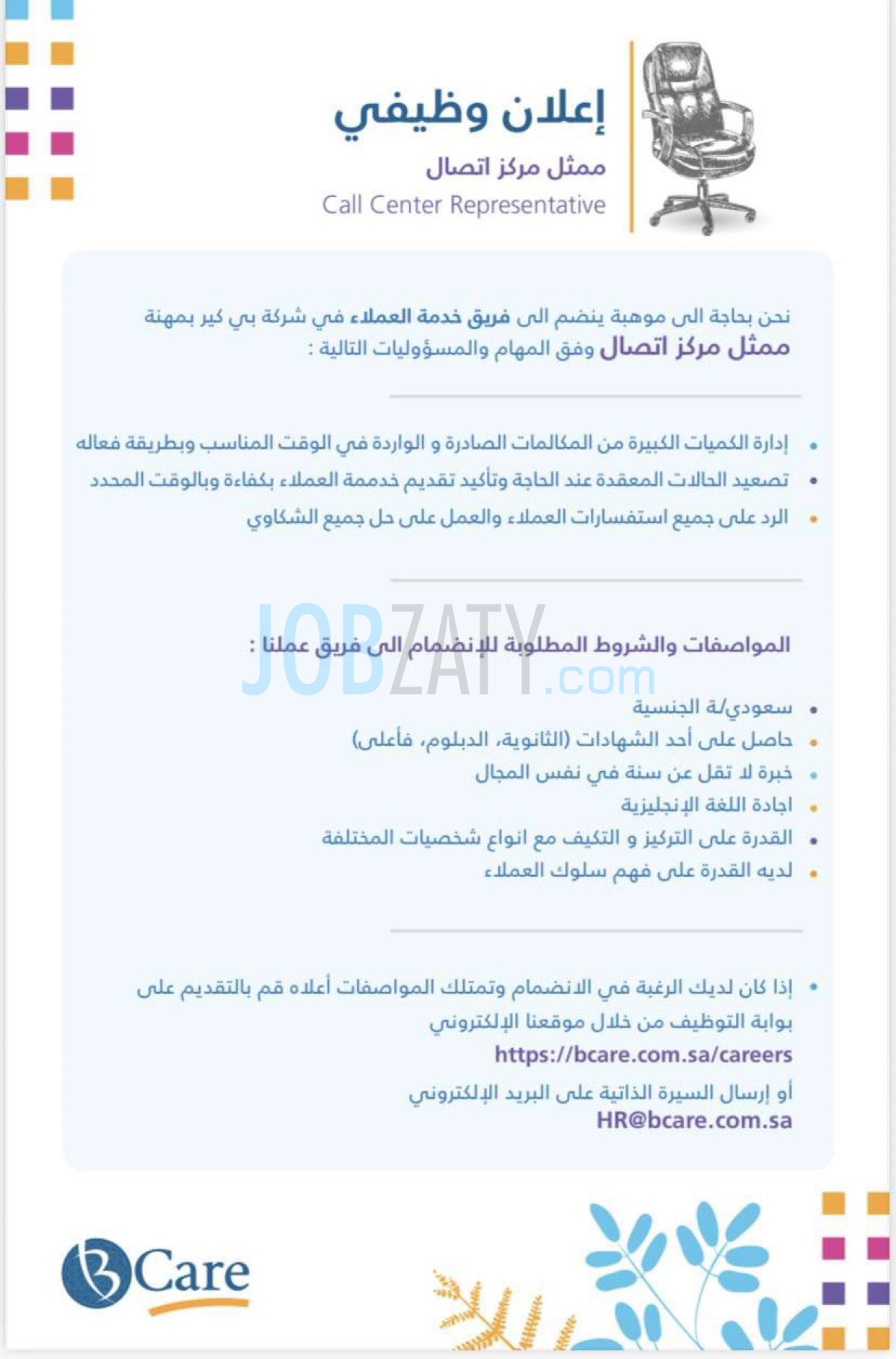 شركة بي كير للتأمين، توفر وظائف خدمة عملاء شاغرة لحملة (الثانوية، الدبلوم فما فوق) بمركز الاتصال للشركة، وفقاً للتفاصيل التالية: