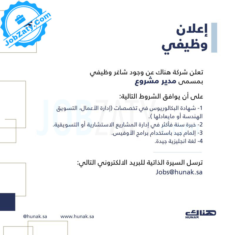 توفر وظائف إدارية شاغرة لحملة البكالوريوس ، للعمل بمجال إدارة المشاريع التسويقية، وفقا للتفاصيل التالية: