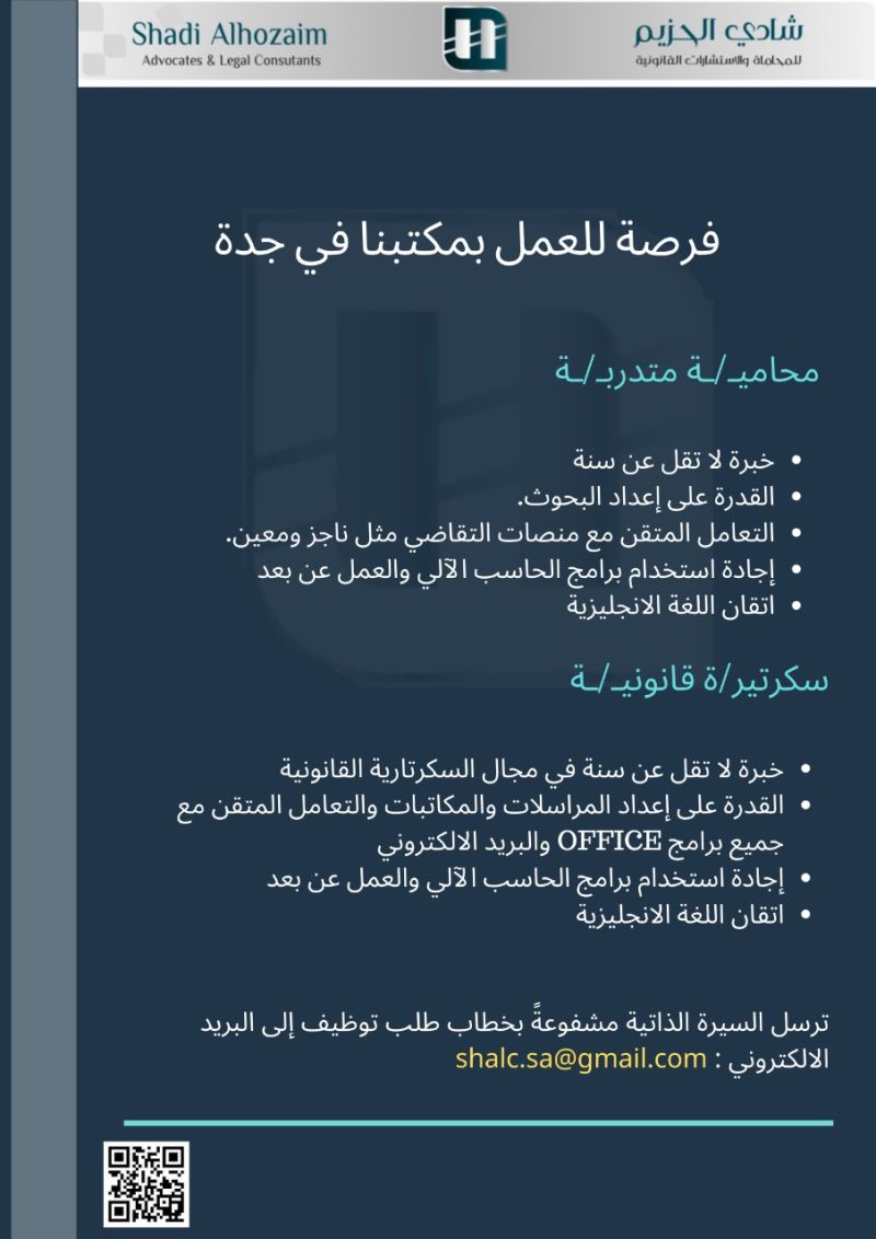 مكتب شادي الحزيم للمحاماة والاستشارات القانونية، يوفر وظائف قانونية شاغرة لحملة البكالوريوس للعمل بعدة مجالات - بمدينة جدة، وفقاً للتفاصيل التالية:
