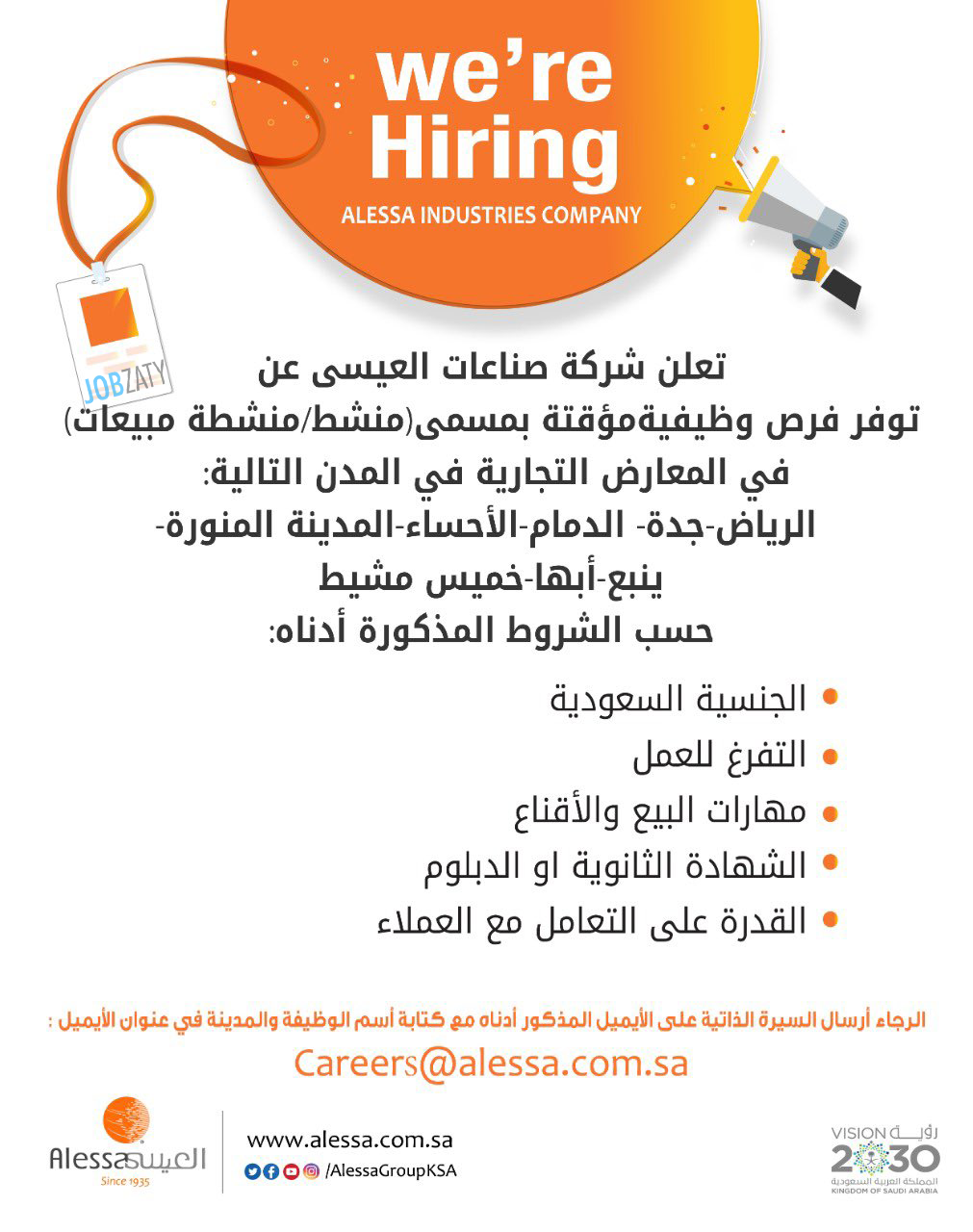 شركة صناعات العيسى (Alessa) تعلن فتح باب التوظيف لحملة الثانوية أو الدبلوم (رجال / نساء) للعمل بفروع الشركة في (8) مدن عبر المملكة - مع ملاحظة أن الوظائف متاحة للسعوديين فقط، وذلك وفقاً للتفاصيل التالية: